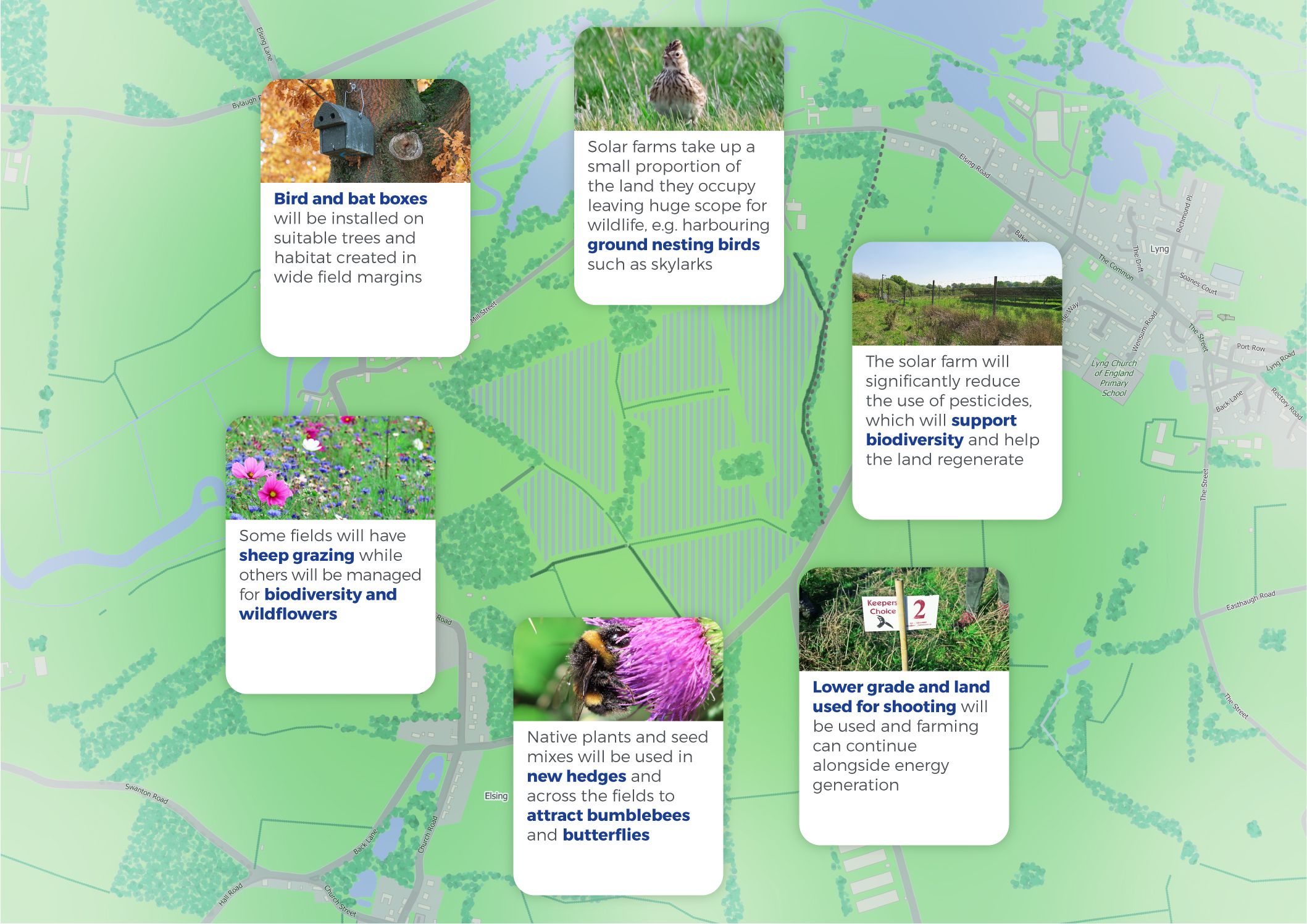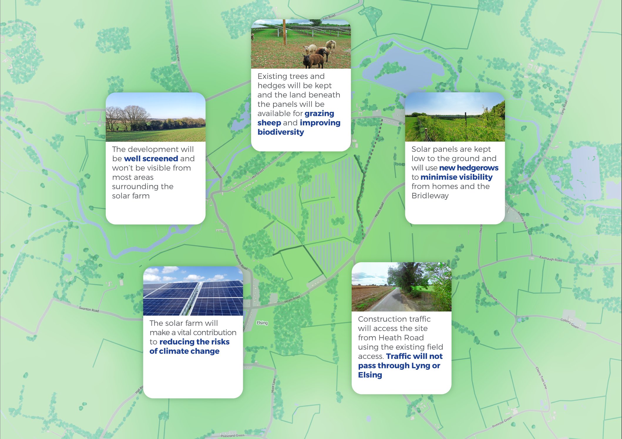Once operational, solar farms generate almost no traffic. During the 16 week construction period, traffic will be routed away from the settlements of Lyng and Elsing.